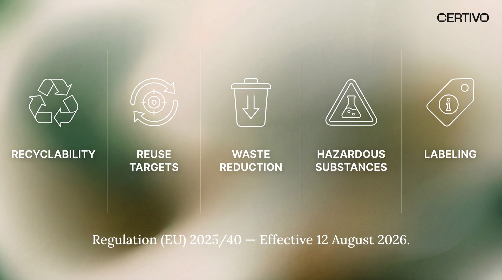 The EU Packaging and Packaging Waste Regulation (PPWR) introduces binding requirements on recyclability, reuse targets, hazardous substance restrictions, and labeling obligations for all packaging placed on the EU market. With general application beginning 12 August 2026, manufacturers, importers, and brand owners across every sector face a compressed timeline to redesign packaging, update supplier documentation, and establish compliant reporting workflows.