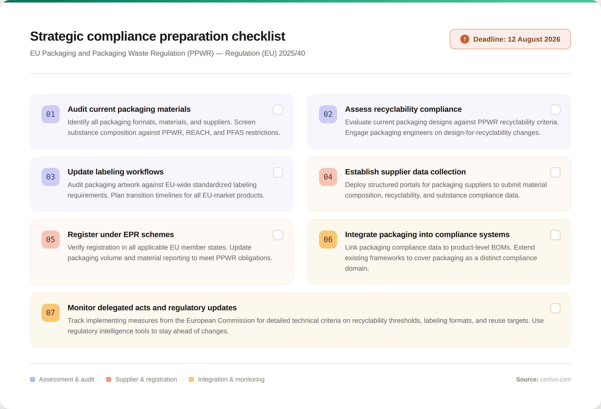 For compliance leaders at global manufacturers, the operational impact is immediate: packaging materials must be audited for substance compliance, recyclability criteria must be evaluated at the design stage, labeling workflows must be updated, and supplier data collection must be structured and automated.