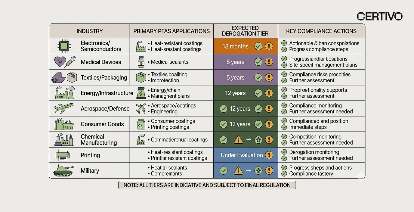 📊 Electronics and semiconductors — PFAS used in photoresists, etchants, thermal management materials, and surface coatings. Semiconductor manufacturing has been specifically identified as requiring longer derogation periods. Manufacturers should review Certivo's guide on PFAS in electronics manufacturing for sector-specific compliance strategies.