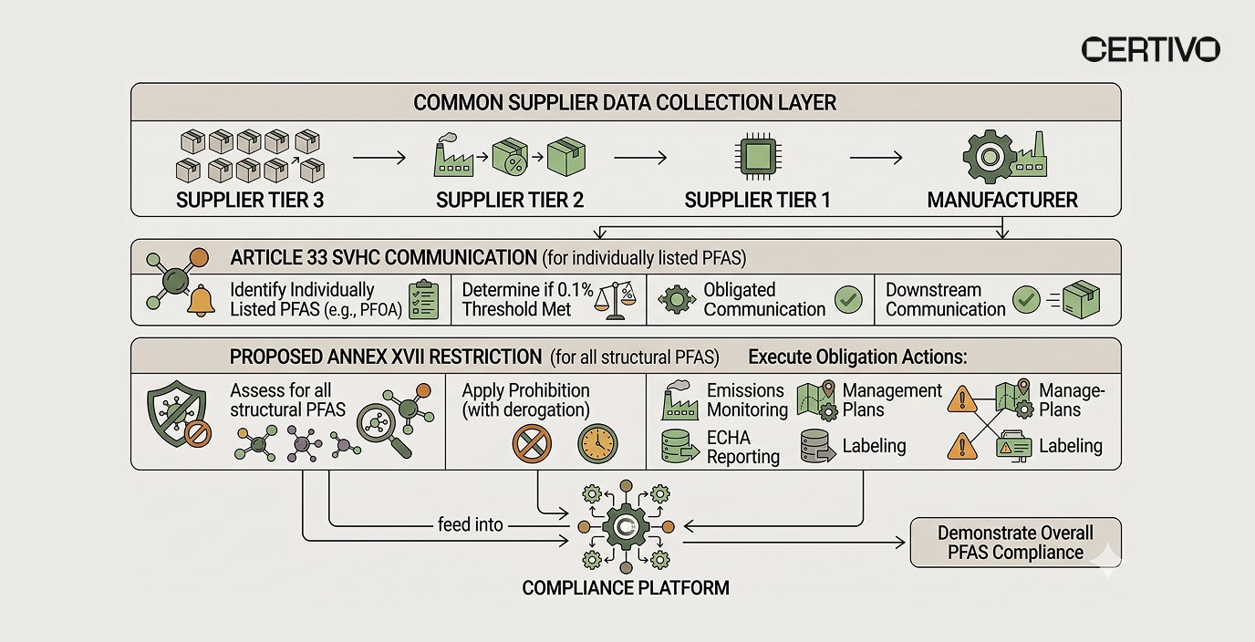 No. The proposed Annex XVII restriction operates in parallel with existing Article 33 SVHC communication obligations. Manufacturers will need to maintain compliance with both: Article 33 for individually listed PFAS SVHCs above 0.1% w/w, and the new Annex XVII prohibition for all structural PFAS. Certivo's centralized compliance data backbone manages both obligation tracks from a single substance database.