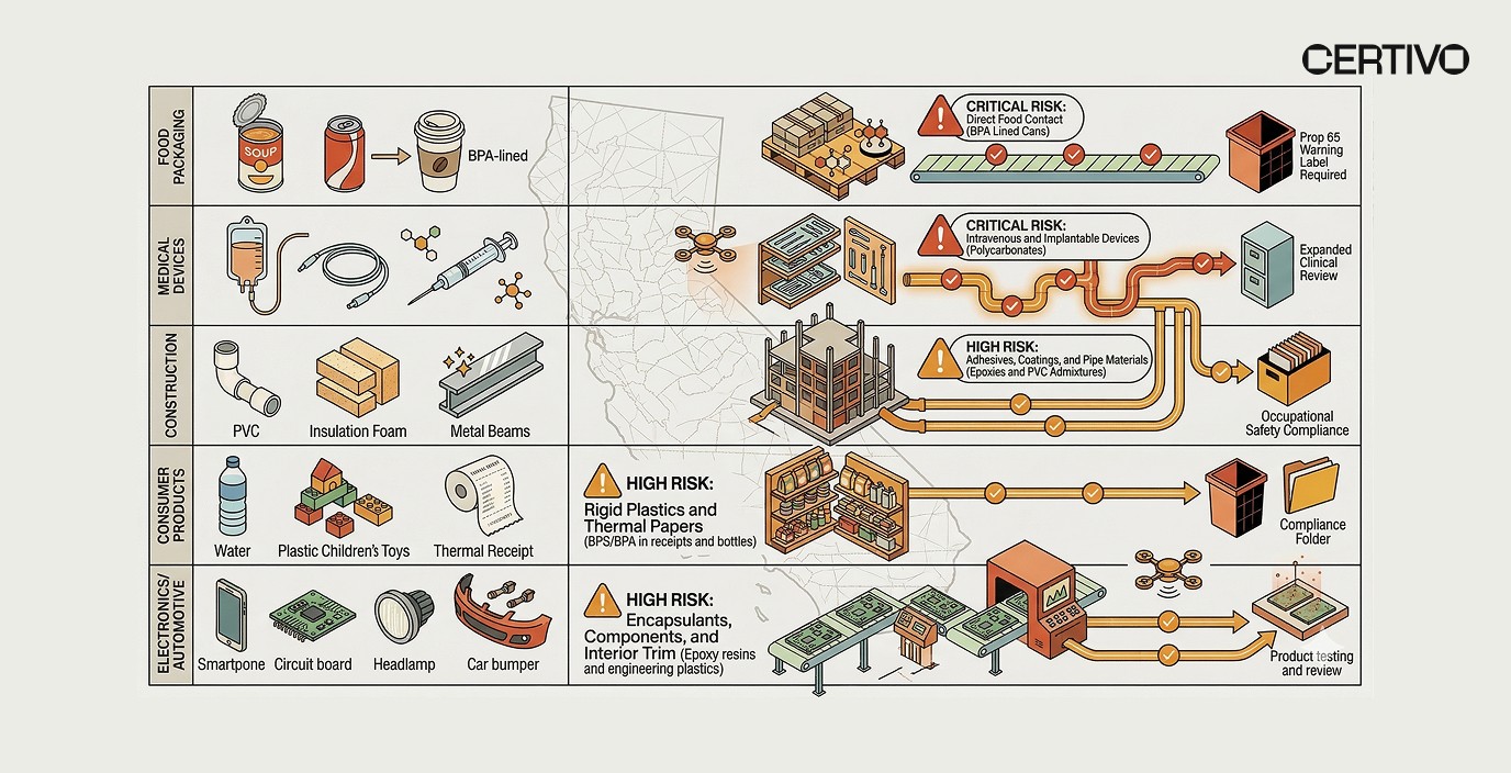 Automotive manufacturers should assess bisphenol presence in interior plastics, adhesives, and coating materials — particularly for vehicles and components sold in California.