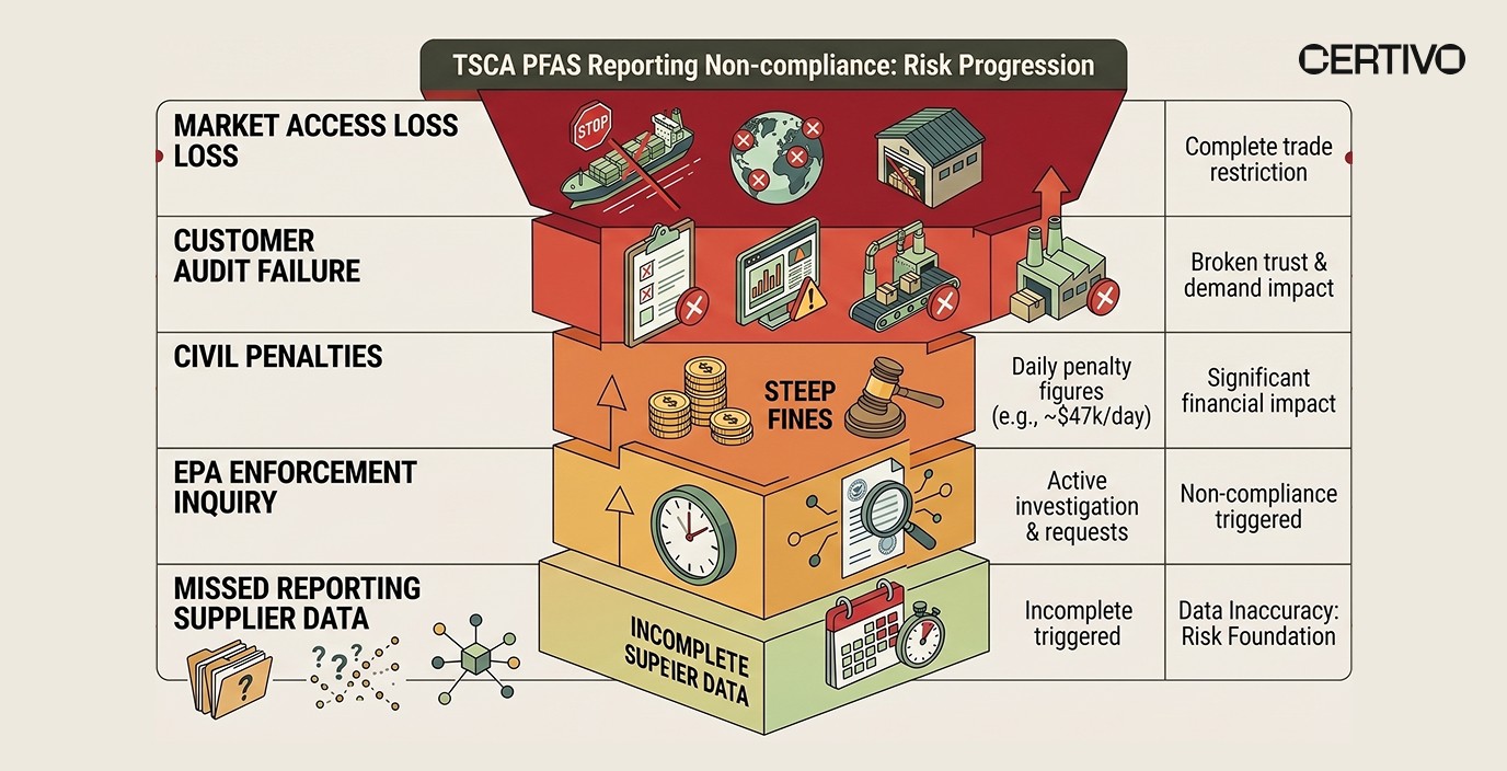 Based on currently available regulatory guidance, TSCA violations can result in civil penalties exceeding $25,000 per day per violation, criminal penalties for willful non-compliance, and mandatory corrective actions. Beyond direct penalties, non-reporting companies risk customer audit failures, exclusion from government contracts, and reputational damage.