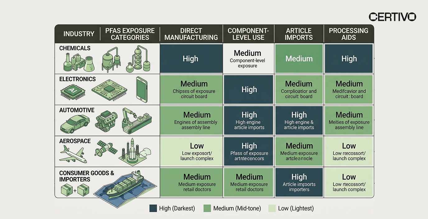 This regulatory shift affects every company that manufactures, imports, or processes PFAS substances in the United States. The scope is broad: over 12,000 PFAS compounds fall under the reporting obligation, spanning chemicals, electronics, automotive, aerospace, consumer goods, and import-distribution operations.