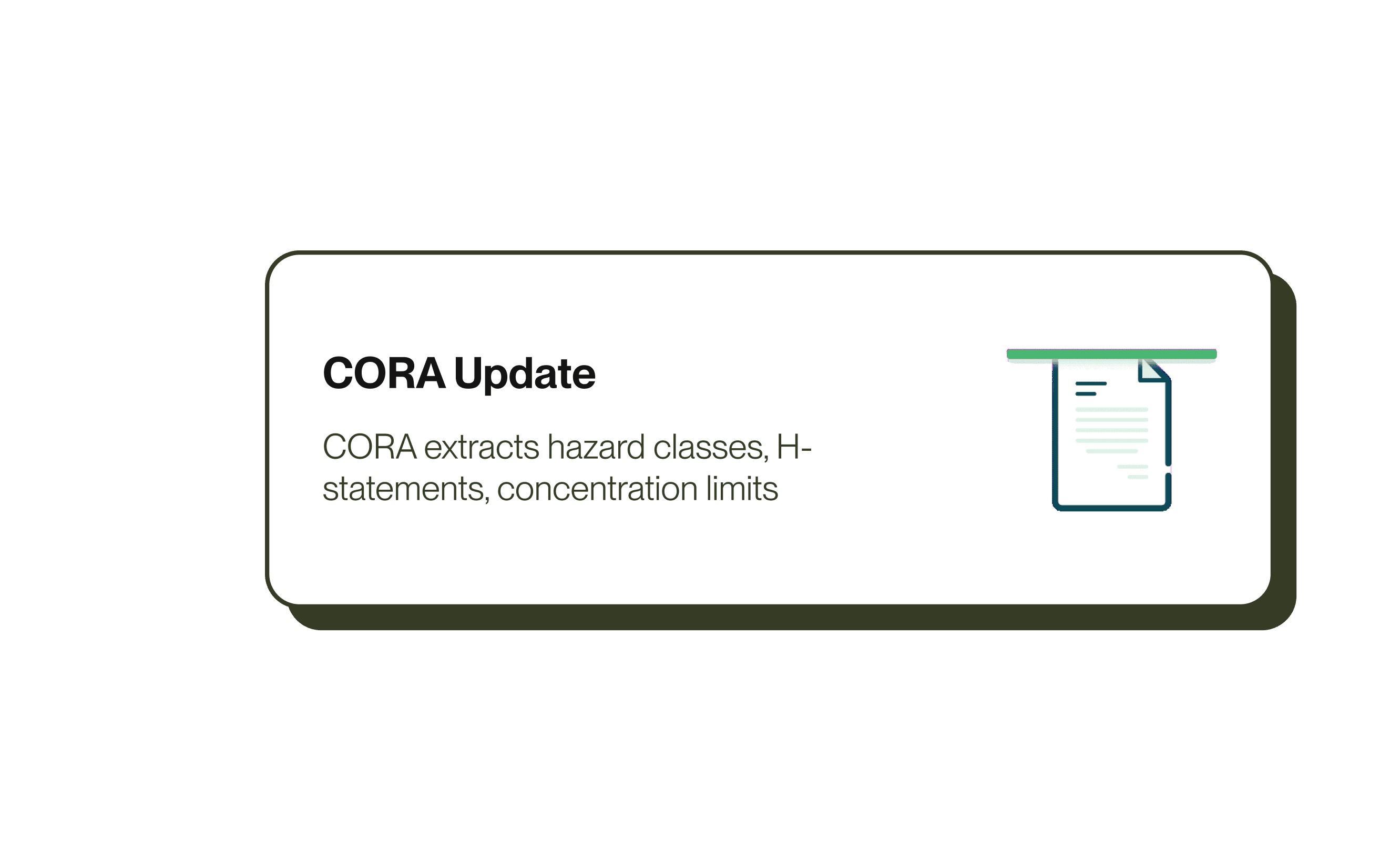 CORA parses and validates supplier SDSs automatically, extracting classification data across all hazard classes. Your team focuses on exceptions—not manually reviewing hundreds of Safety Data Sheets for hazard classification accuracy.