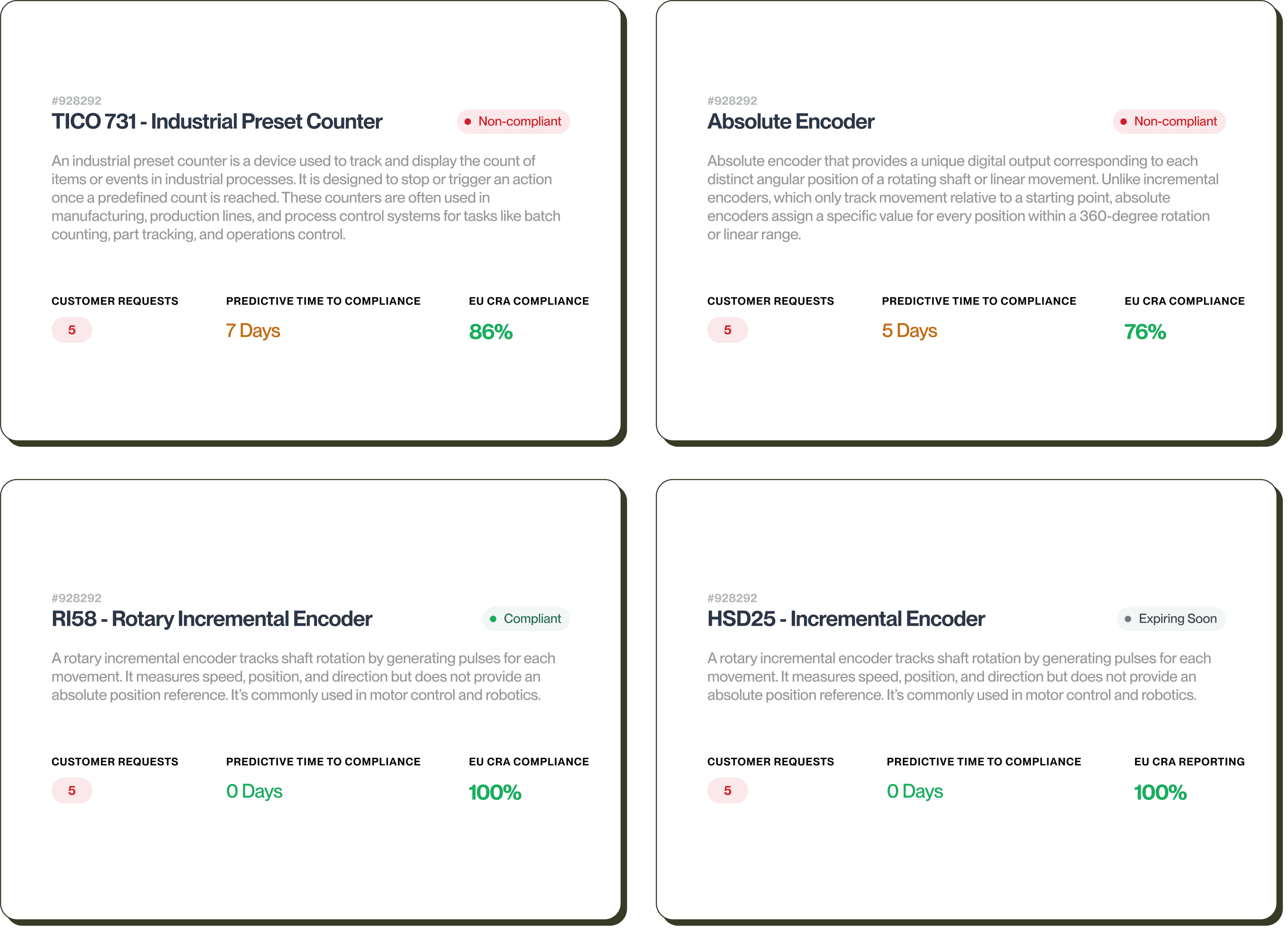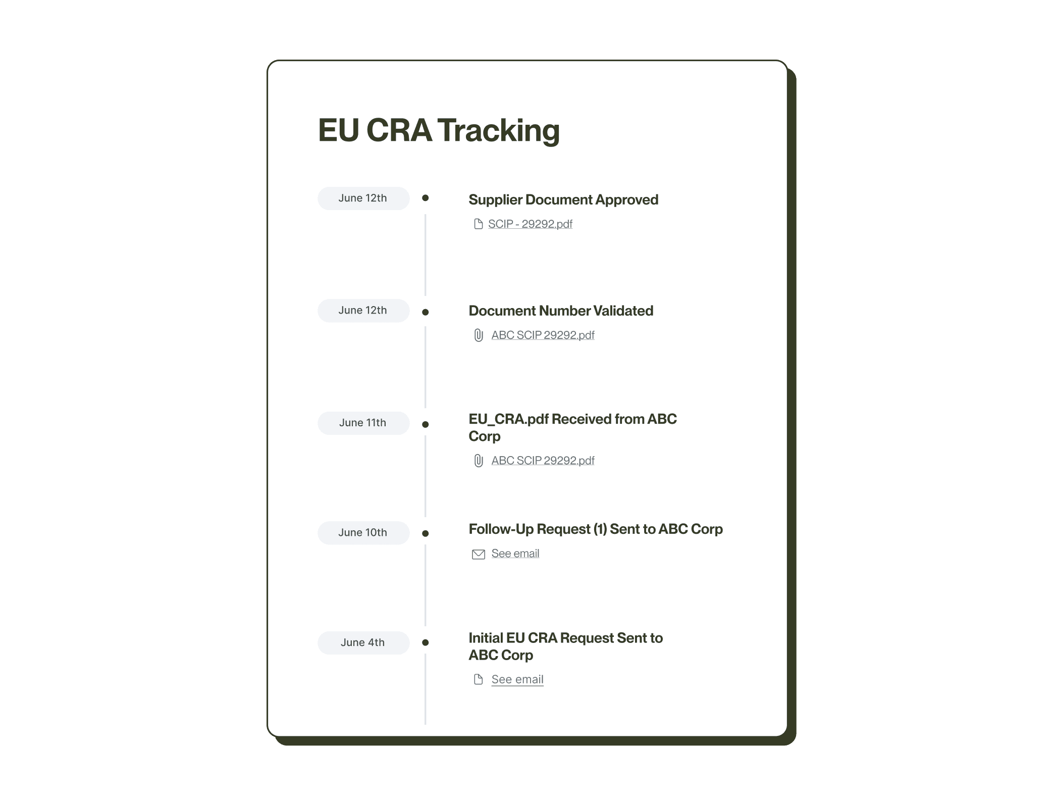 CORA-powered regulatory intelligence collects, parses, and validates supplier cybersecurity evidence automatically. Your team focuses on conformity decisions—not chasing SBOMs and compiling technical files.