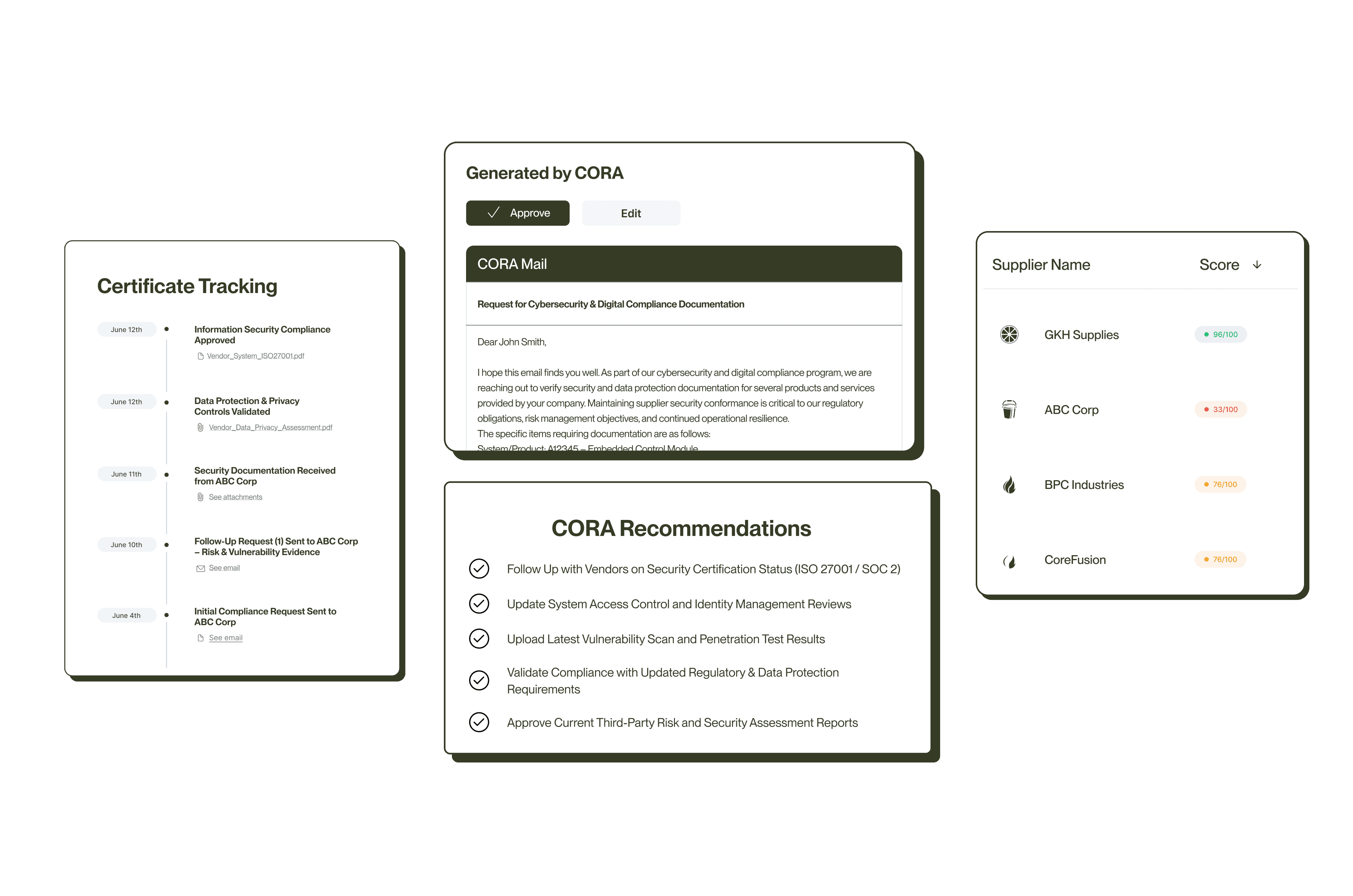 CORA applies AI-native compliance automation to parse supplier questionnaires, SBOMs, and certifications at the control level. It validates completeness across multiple frameworks simultaneously, applies supplier risk scoring ecosystems, and flags gaps or inconsistencies automatically—enabling continuous audit-ready documentation.