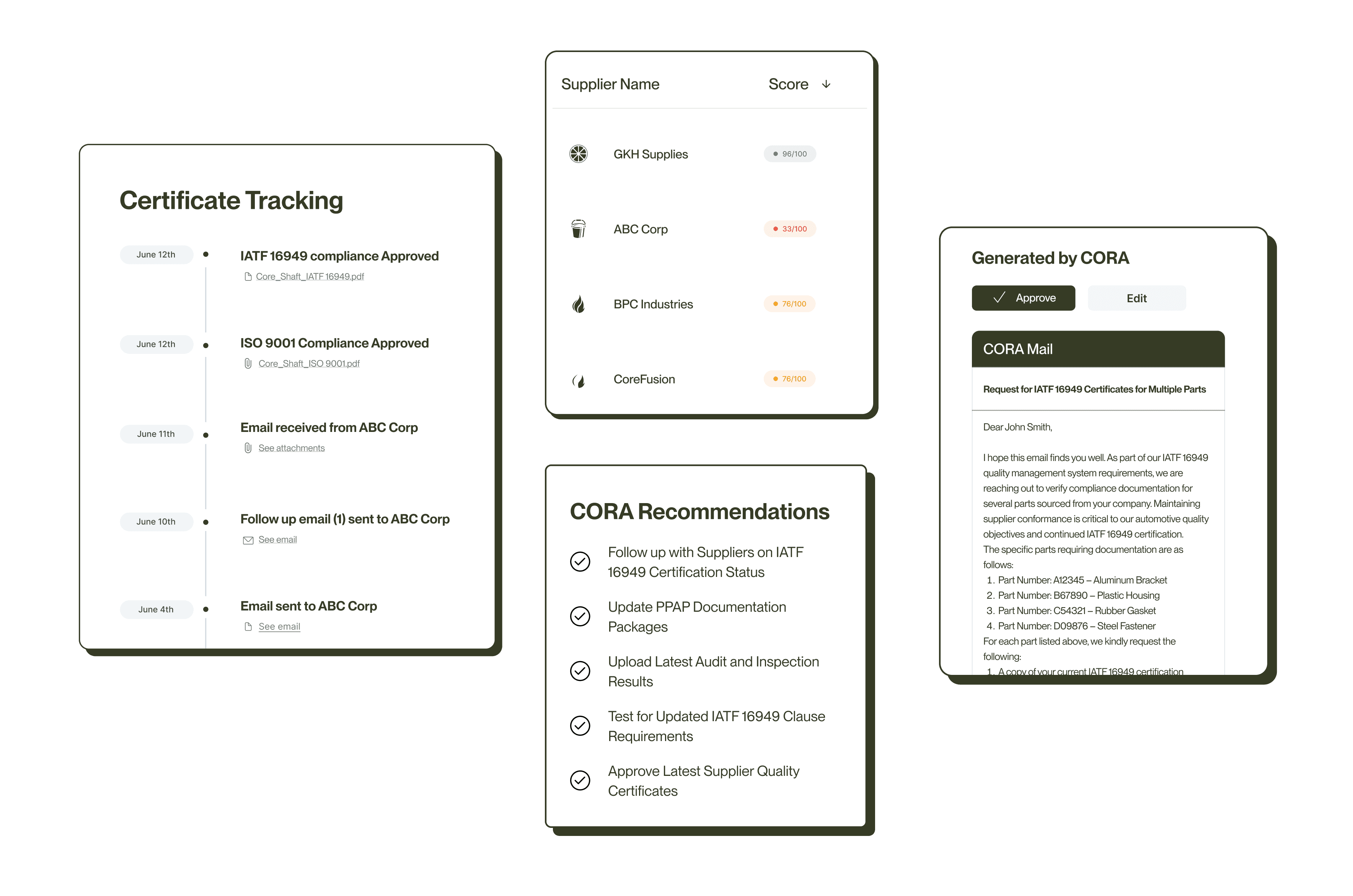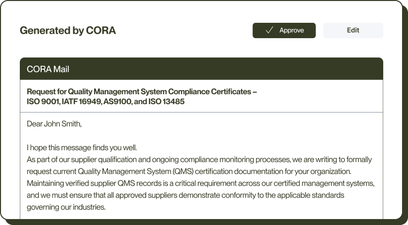 Our AI agent, CORA, validates supplier certificates against IAF, IATF OASIS, and IAQG OASIS databases automatically